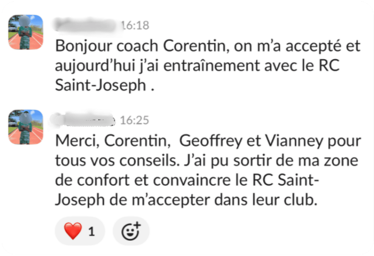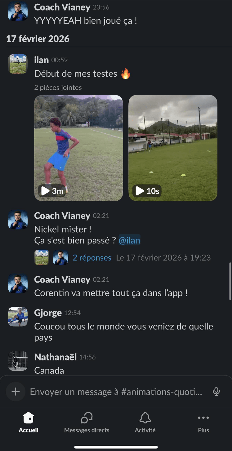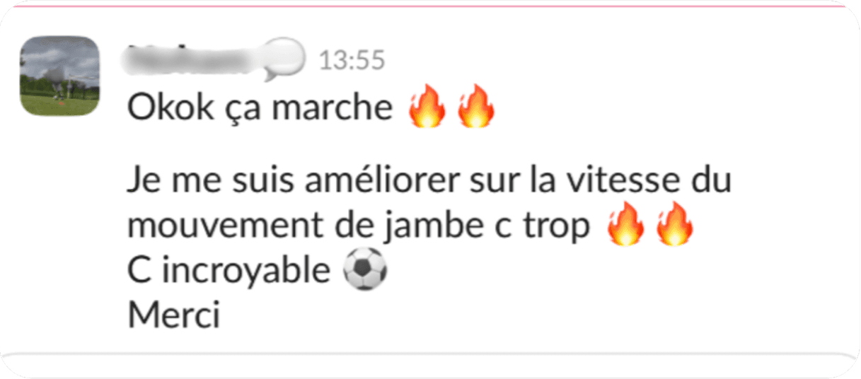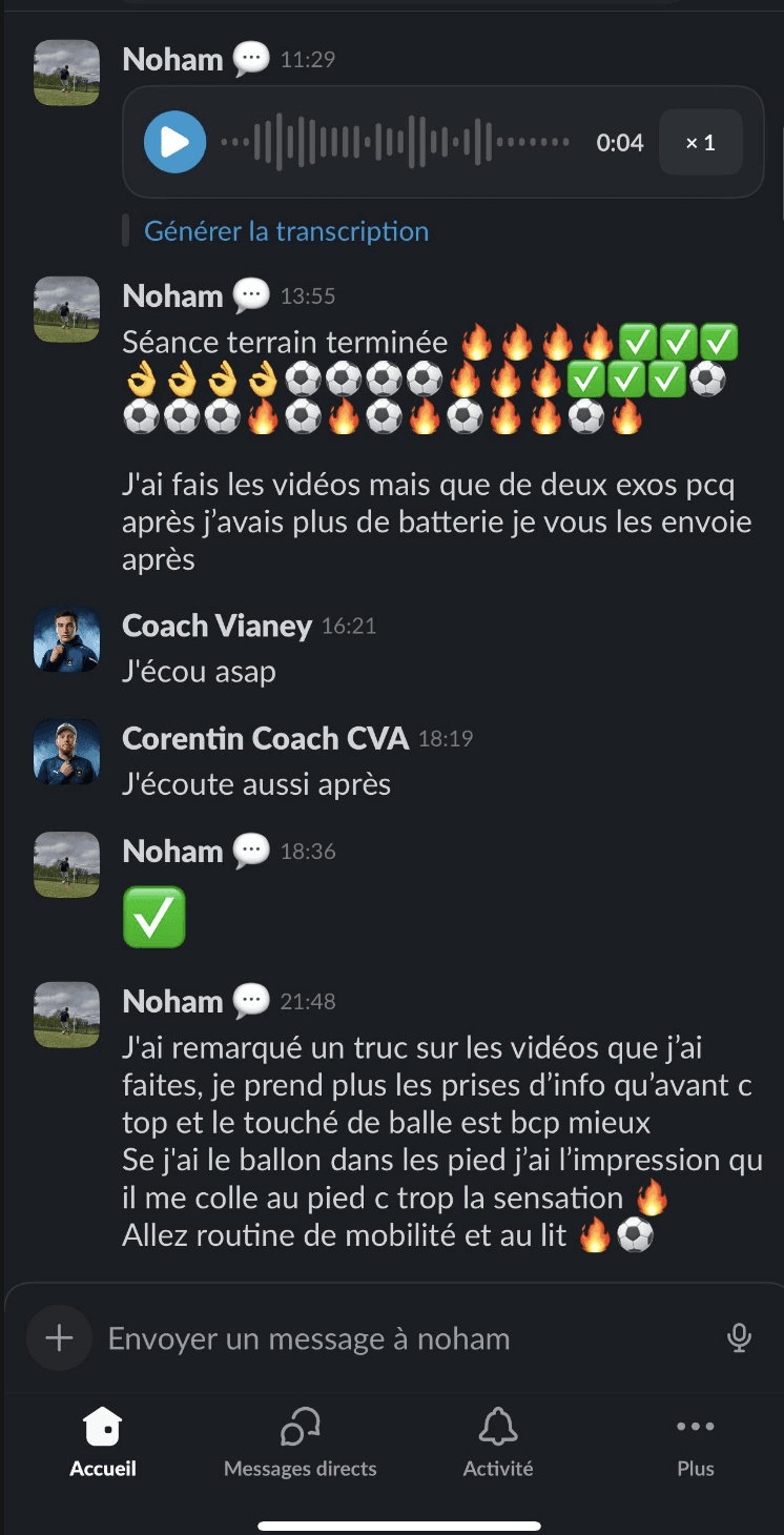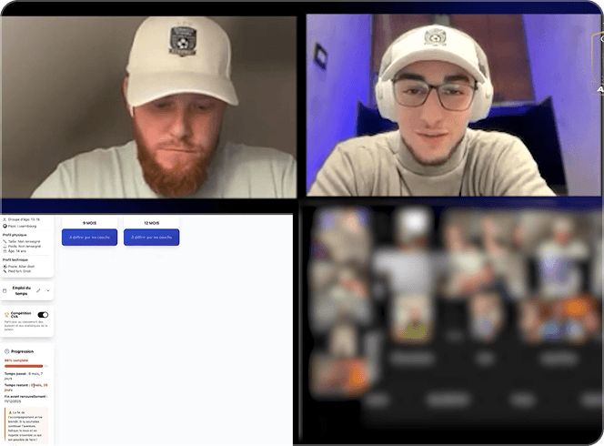 Dès que vous êtes accepté, on démarre comme dans une structure haut niveau, mais depuis chez vous : 1) Diagnostic de départ : échange + analyse du contexte (âge, poste, niveau, objectifs, planning club/école, historique blessures). 2) Plan de travail 100% personnalisé dans notre application privée : séances physiques, routines “invisibles” (mobilité, récup, sommeil, nutrition), objectifs hebdo. 3) Suivi régulier en visio (1-1) : on corrige, on ajuste, on challenge. 4) Retours & corrections : vos vidéos / vos retours servent à affiner le travail (technique/tactique selon le suivi). 5) Ajustements continus : si le planning change (matchs, fatigue, blessure, examens), on adapte immédiatement pour progresser sans surentraînement. 6) Cadre + discipline : on suit la constance, on structure la semaine, et on installe des habitudes durables. 👉 En clair : ce n’est pas “un programme envoyé”. C’est un accompagnement réel, personnalisé, avec un coach qui suit votre enfant sur la durée.